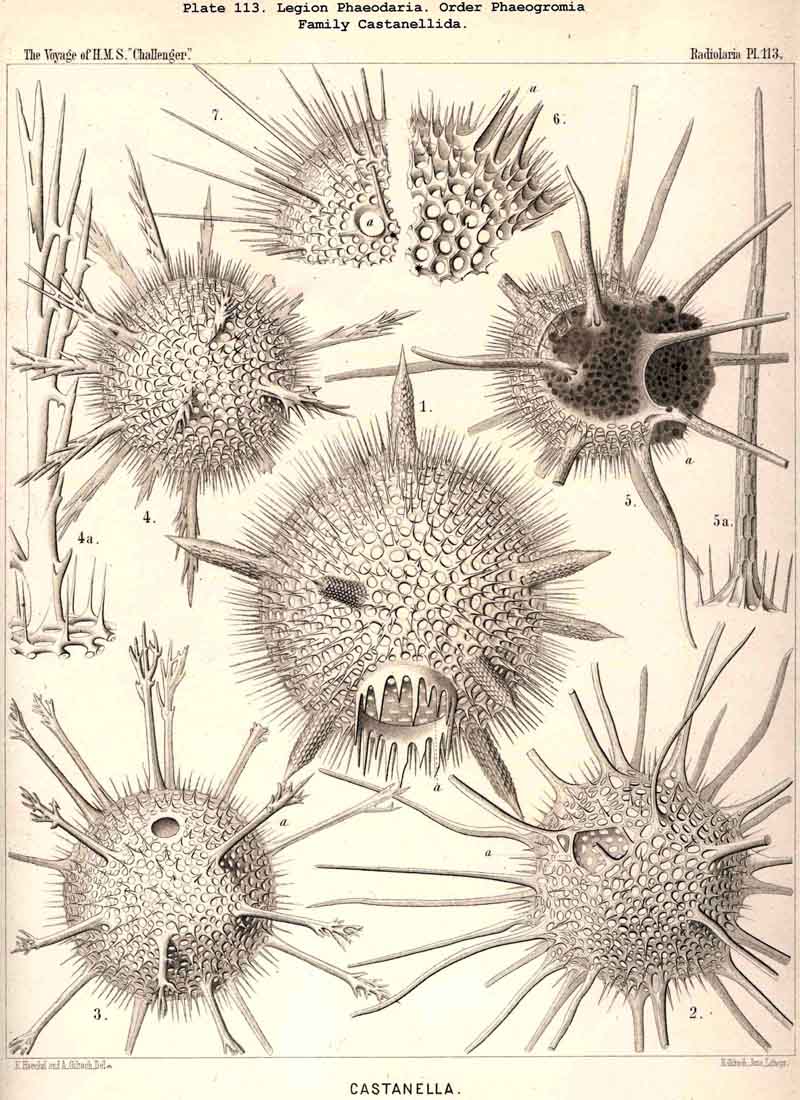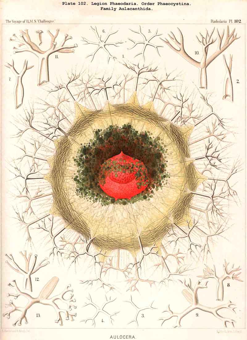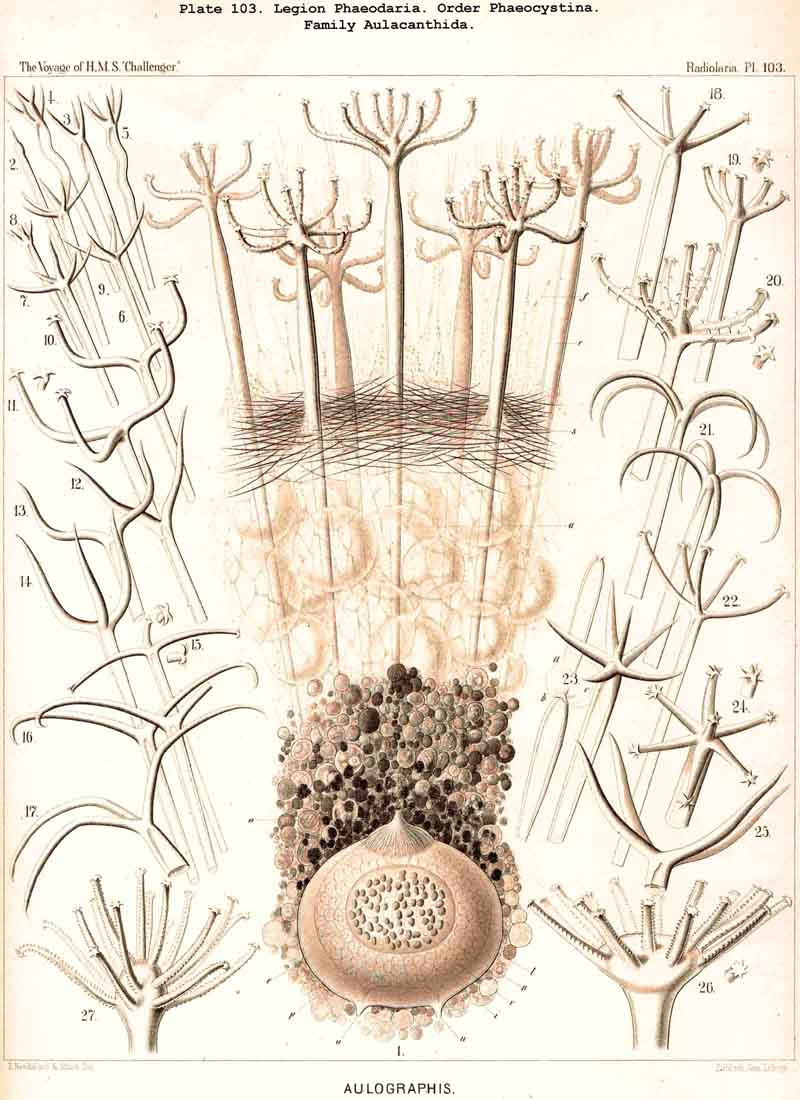 A. The phaeodium of Aulacantha, Thalassoplancta, and Coelodendrum was first described in 1862, in my Monograph, as an excentric extracapsular mass of pigment of blackish-brown or olive-green colour (pp. 87, 262, 264, 361, Taf. ii. iii. xxxii.). Since then John Murray, who investigated many living PHAEODARIA during the Challenger expedition, has shown its general distribution in this legion (Proc. Roy. Soc. Lond., vol. xxiv. p. 536, 1876). From the constancy of its presence I gave the legion the name PHAEODARIA in 1879 (L. N. 34).