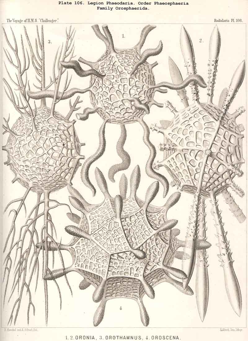 99. The Exoplasm of the Monopylea.-The extracapsular protoplasm of the NASSELLARIA or MONOPYLEA arises only from the porochora, or the intracapsular podoconus, the oral base of which is formed by this porous area. The pseudopodia or protoplasmic threads which pass through the pores of the latter, united into a bundle, are not very numerous (in most NASSELLARIA probably between thirty and ninety), and unite just outside it to form a thick discoid sarcomatrix; this covers the porochora completely below, and spreads out in the form of a thin envelope of exoplasm over the whole surface of the central capsule; at the apical portion of the latter the sarcomatrix is often so thin that it can only be recognised by the aid of reagents; it separates the membrane of the central capsule from the surrounding calymma. The pseudopodia, which penetrate the latter and by loose anastomoses form a wide-meshed sarcoplegma within it, are usually not very numerous. The greater part of them radiate in a bunch downwards from the basal disc of the sarcomatrix, and a smaller number arise from the thinner envelope which covers the remainder of the central capsule (Pl. 51, fig. 13; Pl. 65, fig. 1; Pl. 81, fig. 16). On the outer surface of the calymma the collopodia, which have passed through it, unite to form the sarcodictyum, and through the siicification of this the primary lattice-shell arises in the great majority of the NASSELLARIA. From the surface of the sarcodictyum arise the astropodia, or free pseudopodia which radiate outwards into the water. Their number in most MONOPYLEA is relatively small, but their length appears to be very great.