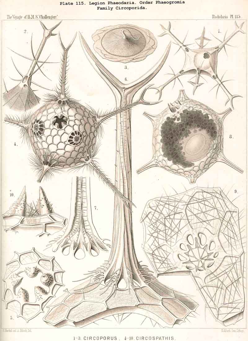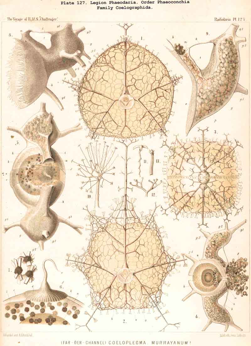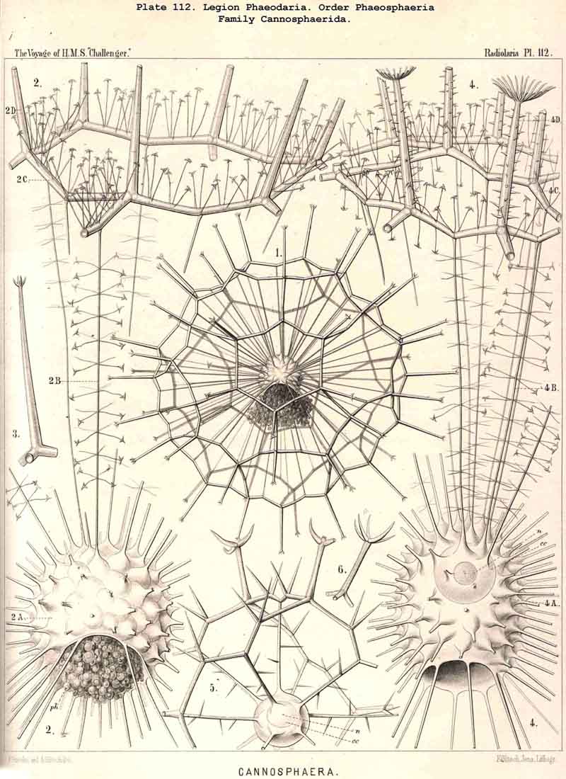 83. The Structure of the Calymma.-The extracapsular jelly-veil appears structureless in most Radiolaria, inasmuch as it represents a homogeneous pellucid excretion of the exoplasm and contains neither fibres nor other formed structures. In some groups, however, definite structural characters become secondarily developed. The most common and striking of these is the formation of alveoles, which takes place in the extracapsulum (see § 86). In consequence of this the calymma assumes a remarkable frothy consistency and appears to be composed of large, clear, thin-walled vesicles; this is especially the case in the Collodaria (Colloidea, Pls. 1,3, and Beloidea, Pls. 2,4), and in many large PHAEODARIA, especially among the Phaeocystina (Phaeodinida and Cannorrhaphida, Pl. 101, and Aulacanthida, Pls. 102, 103,104). More rarely the calymma is not permeated by vacuoles, but there appear in it fine striae parallel to the surface as though it were composed of thin concentric laminae like an onion; perhaps these are the expressions of a different quantity of water in the various layers. In the calymma of many Radiolaria thin, straight, radial lines are to be seen, which are probably pseudopodia, and not to be attributed to any structural modification, or they may be slender canals which serve for the exit of the pseudopodia. On the outer surface of the calymma of different Radiolaria, and especially in the ACANTHARIA, a peculiar network of fibres is to be found, composed of polygonal meshes, like elastic fibres, probably due to a local thickening of the jelly. These polygonal meshes are often very regularly distributed between the radial spines of the Acanthometra, and stand in a definite relation to them. The fibres which form the meshes are often rather strong, resembling elastic fibres, as above-mentioned, and either simple or composed of bundles of very fine fibrillae (L. N. 33, p. 15, Taf. i. fig. 1, Taf. ii. fig. 4).