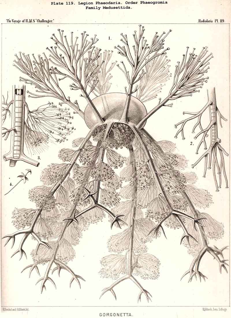 The jelly-veil of the Radiolaria was recognised even by the earliest observers of the group, Meyen (1834), and Huxley (1851), and compared with that of the Palmellaria; the former noticed it in Physematium and Sphaerozoum (L. N. 1, p. 283), and the latter in Thalassicolla and Colbosphaera (L. N. 5, p. 433). In all these SPUMELLARIA, both in the monozootic Thalalassicolla and in the polyzootic Sphaerozoum and Collosphaera, the calymma is very voluminous and filled with large alveoli. Meyen called them "muco-gelatinous masses, in the interior of which are contained small equal-sized vesicles"; Huxley likewise found clear vesicles in the jelly and compared them with Dujardin's vacuoles. Johannes Müller observed the jelly-veil in many different Radiolaria, in particular in the Acanthometra, first discovered by him, but erroneously believed that it only originated after death by liquefaction of the sarcode (L. N. 12, p. 6). This mistake is, however, easy to understand, since in living Radiolaria the calymma is usually invisible on account of its perfect transparency, whilst in dead specimens it is usually quite distinct on account of the dust clinging to its adhesive surface. I myself believed that the formation of the voluminous hyaline jelly-veil was only partially due to liquefaction after death, but that it was to some extent present in the living organism and that it might vanish and subsequently reappear by means of imbibition (L. N. 16, pp. 109, 110). R. Hertwig was the first to demonstrate, in 1879, that the jelly-veil is constantly present in living Radiolaria, that it forms the basis of the extracapsular malacoma and surrounds the central capsule as a second protective sheath (L. N. 33, p. 114).