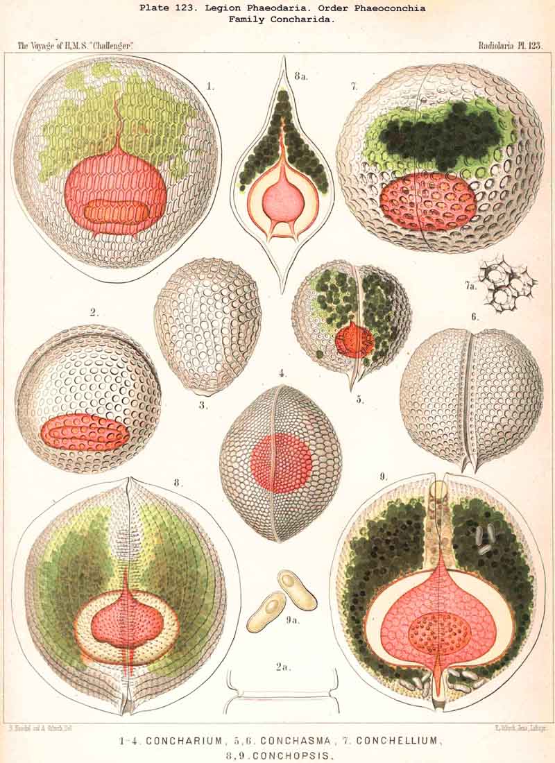 89. The Phaeodium of the Phaeodaria.-The PHAEODARIA, which are distinguished from the other three legions of Radiolaria by the double membrane of the central capsule, and the peculiar structure of the main-opening (astropyle), differ also in other points, the most important of which is the constant presence of a voluminous mass of extracapsular pigment. This possesses a peculiar constitution and special significance, and is not to be confounded with the extracapsular pigment-granules of other Radiolaria (e.g., Thalassicolla), and hence it has been distinguished by the name "Phaeodium," and the individual granules which compose it as "Phaeodella" (see note A). The phaeodium is always excentric in position relatively to the central capsule, of which it surrounds the oral half in the form of a voluminous concavo-convex cap, hiding the astropyle at its basal pole so completely that the latter is rarely visible until the phaeodium has been removed (Pls. 99-104; Pl. 115, fig. 8; Pl. 123, &c.). The central capsule is generally almost completely embedded in the phaeodium, so that only its aboral pole (with the two parapylae in the TRIPYLEA) projects. In the Phaeogromia, in which the lattice-shell possesses a special opening and the central capsule lies excentrically in the aboral portion of its interior, the phaeodium occupies the oral aspect, between the capsule and the aperture (Pls. 99, 100, 118, 119, 120, &c.). In the peculiar family Coelographida (Pls. 126, 127,128) a special receptacle (galea with its rhinocanna) for the phaeodium is developed outside the bivalve shell, within which the central capsule lies. The proboscis, which in all PHAEODARIA arises from the centre of the astropyle, lies in the vertical axis of the phaeodium, and is entirely surrounded by it. The volume of the phaeodium in the majority of the PHAEODARIA may be said to be about as great as that of the central capsule, although in some species it is consider ably larger. Its colour is always dark, usually between green and brown, commonly olive-green or blackish-brown, rarely reddish-brown or black. The phaeodellae or pigment-granules which make up the greater part of the phaeodium (see note B) are irregular in form and unequal in size and show no definite structure; usually they are spherical or ellipsoidal, and exhibit fine parallel striae which run transversely or obliquely (Pl. 101, fig. 3, 6, 10; Pl. 103, fig. 1, &c.). Between the larger granules is usually found a thick dust-like mass of innumerable very small grains. The physiological significance of this peculiar phaeodium is still unknown, but is probably considerable, judging from its large size and especially from its constant topographical relation to the astropyle; the latter consideration would lead to the supposition that it plays an important part in the nutrition and metastasis of the PHAEODARIA (see note C).