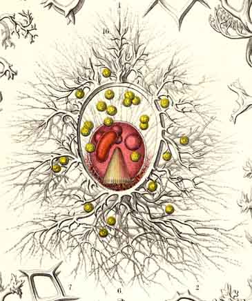 | The ovate, red-coloured central capsule exhibits in the lower half the striate podoconus, in the upper half four oil-globules, and at the left the kidney-shaped nucleus. Numerous "yellow cells" or xanthellae are scattered in the calymma, which contains brown pigment around the porochora. Numerous pseudopodia radiate from the supporting spines of the sagittal ring. |